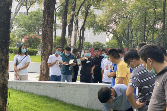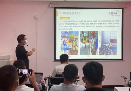 此次培訓(xùn)以講座+現(xiàn)場觀摩的形式進行。深港二期項目經(jīng)理張云海首先對整個項目實施過程中主要分項工程的施工要點與經(jīng)驗,包括如何解決園林景觀施工中眾口難調(diào)、返工頻繁的問題;進行第五立面(屋頂)涂料工程施工時如何解決涂料與原屋面之間的粘接問題、如何抗裂、如何雨天施工;進行石材、路緣石以及透水磚安裝工程施工時,如何讓縫隙均勻、對縫整齊;進行喬灌木種植時如何選取優(yōu)質(zhì)苗木;進行草皮種植施工時的要點,等等一系列的問題進行了一一的講解與分享。